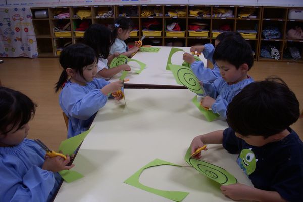 ハサミを使ってぐるぐるへびを切りました。曲線も紙を持つ手を動かしながら、上手に切ることができたね!