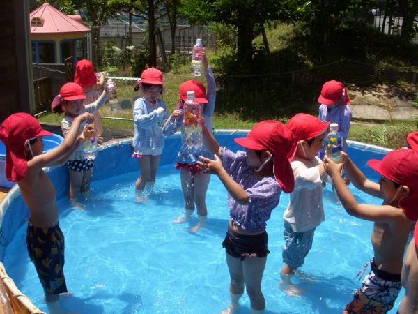 良く晴れた日にプール遊びをして、自分の作ったペットボトルシャワーを楽しみました。待ちに待ったプール遊びはとても楽しそうでした♡
