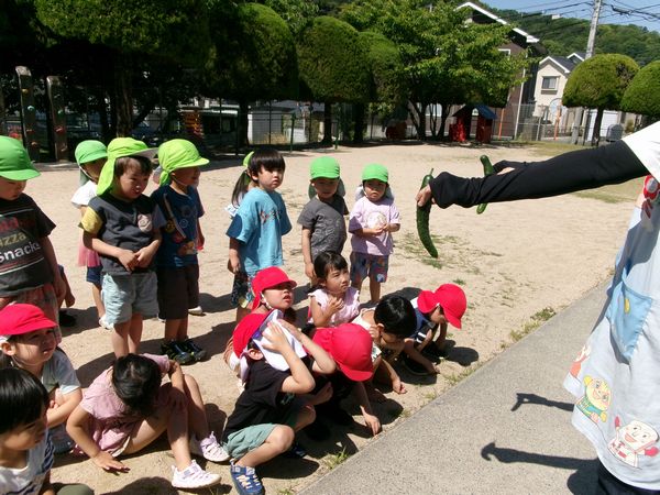 キュウリの収穫をしました!幼稚園でできたきゅうりは、美味しかったね!