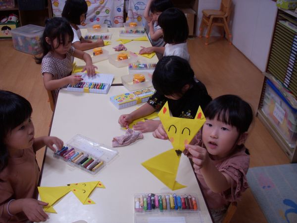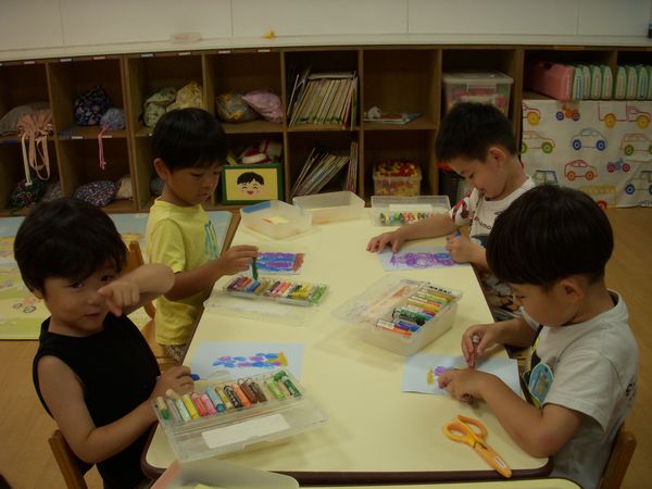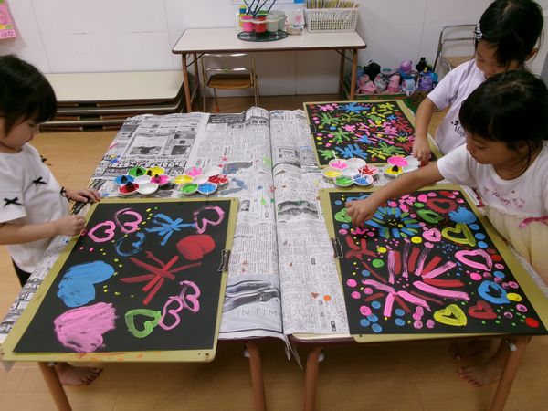 絵の具あそびでは花火を描きました!みんな夏休みに見たよね!「ひゅ~バーン‼」と大きく筆を動かしたり、スタンプをしたりしました!