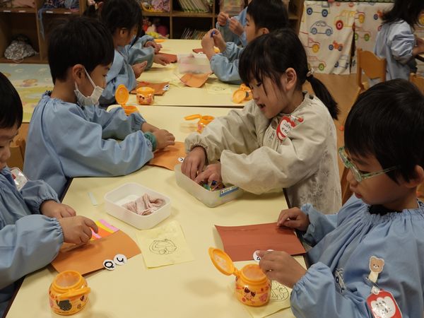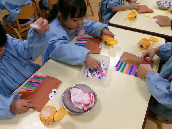 製作では、天井飾りのミノムシと月刊絵本の付録「くまさんのおもちつき」を作って楽しみました★