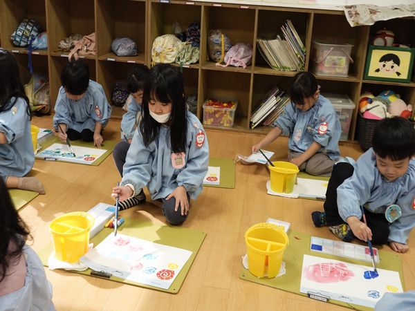 水彩あそびでははじき絵を楽しみました!白いクレパスで描いた絵が絵具を塗ると浮き出てくる様子に「すごーい!」とワクワクしていました!