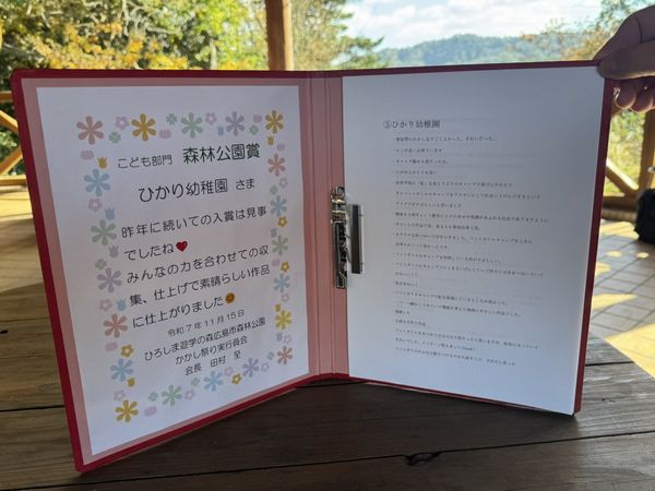広島市森林公園で開催されたかかしまつりで、みんなで作ったかかしが「森林公園賞」をいただきました。みんな喜んでいました!