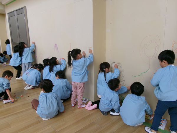 工事中の壁に自由にお絵かきをしました!一階のホールが素敵な絵でいっぱいです♡工事の完成が楽しみだね!