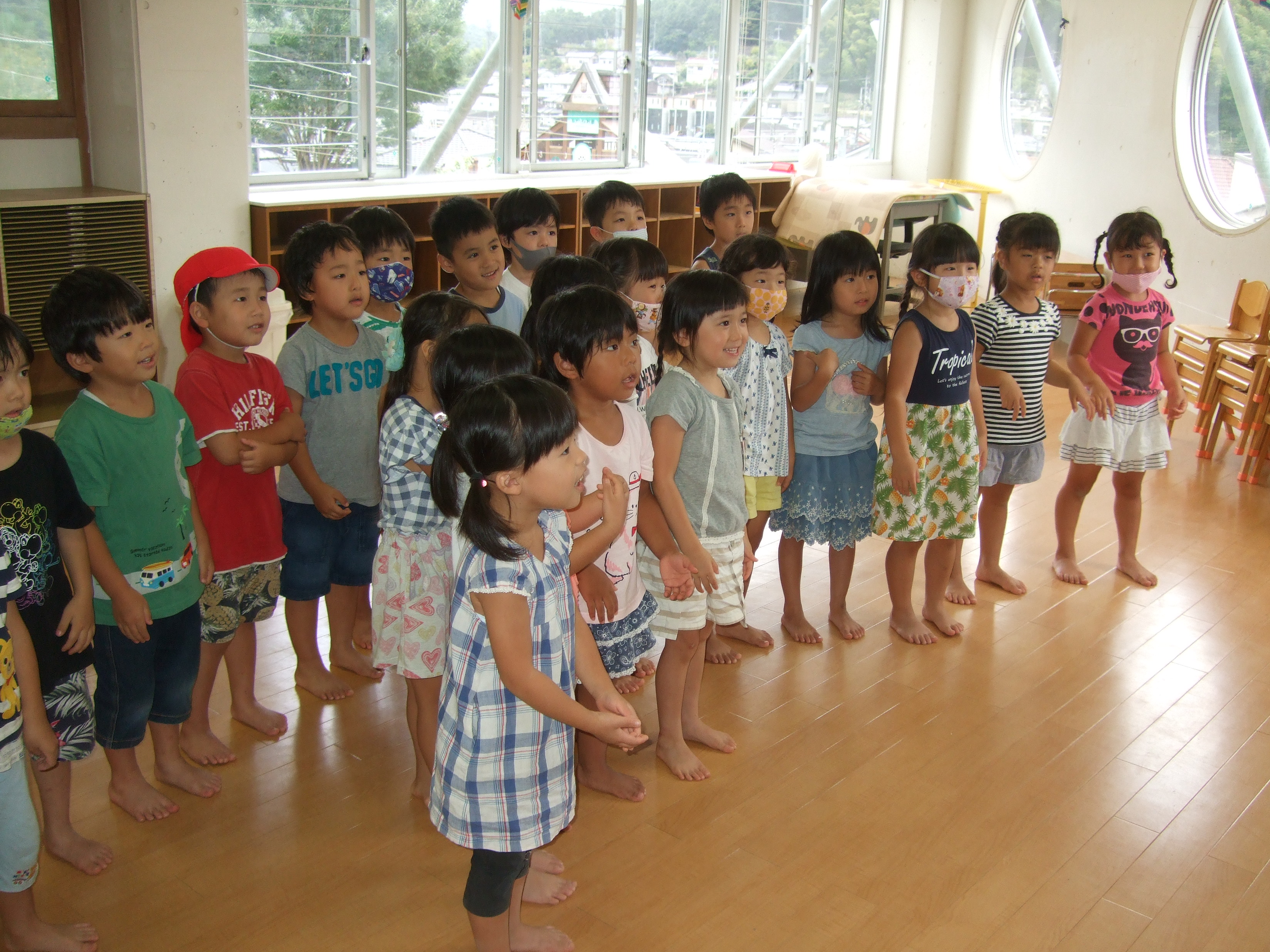 最後はみんなで輪になり、音楽に合わせて大きくなったり小さくなったり、立ったり座ったりしました☆とっても楽しかったみたいで、部屋に帰ってからも歌を口ずさんでいました☆