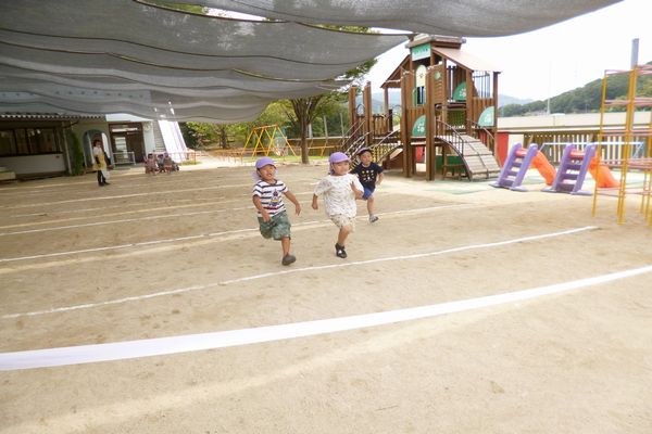 かけっこもしました。ゴールテープを目指して一生懸命走る姿はとてもかわいいです。お友だちもたくさん応援してくれます。