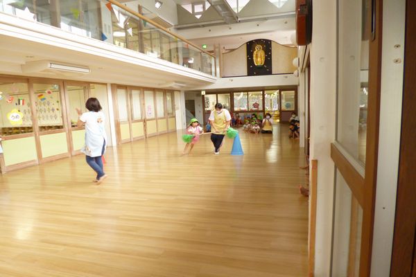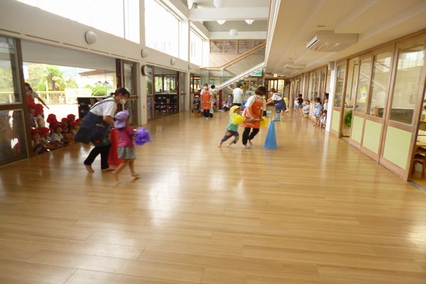 今日はバトンを持ち、コーンを回って次の相手に渡す親子競技である、「Go!Go!ハリケーン」をしました。