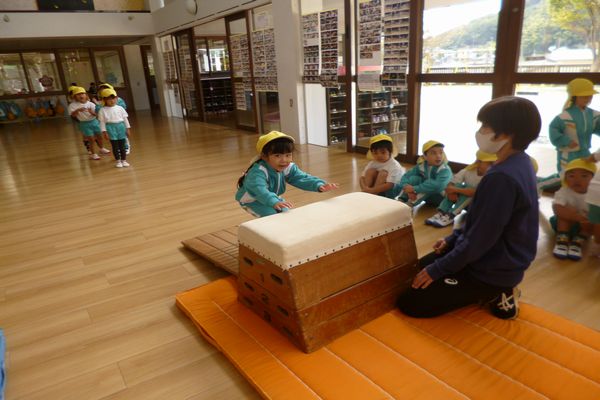 手をついて、グーの足でぴょんと跳び、跳び箱の上に正座をして乗ったり、おりたりしました!