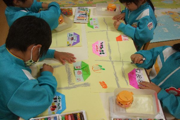 今日は、折り紙で作ったおうちとお店を貼って、みんなのまちを作りました。