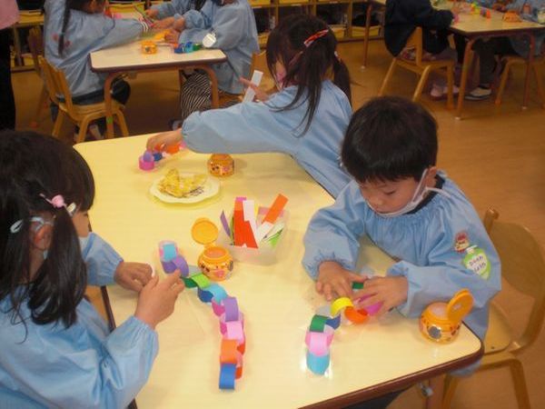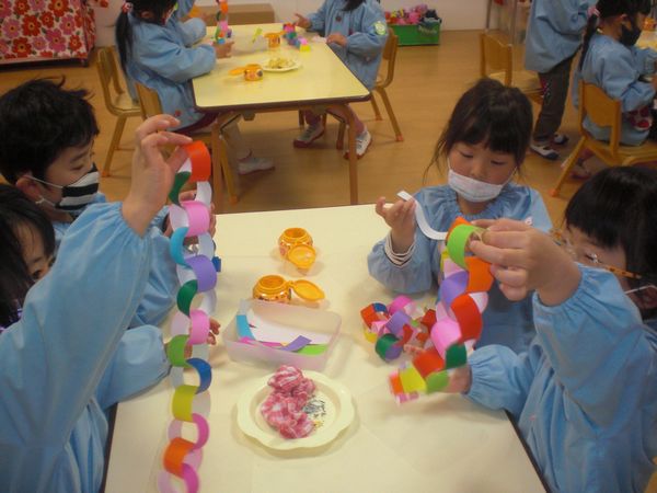 1年間、仲良く過ごしてきたクラスのお友達とももう少しでお別れです。 ずっとずっと仲良しでいようね♪の気持ちを込めて輪つなぎを作りました♡ 長~くなった輪つなぎをお部屋に飾ると大喜びでした☆彡