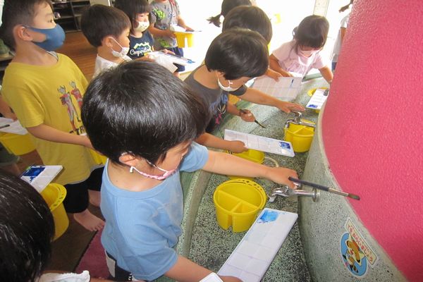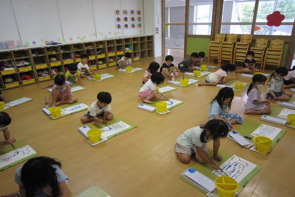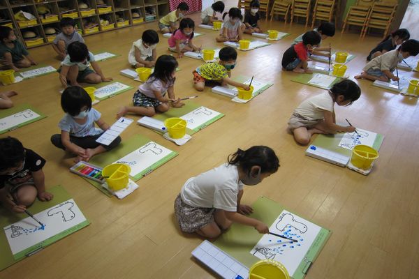 今日は、初めて自分の絵の具をつかってえのぐあそびをしました!