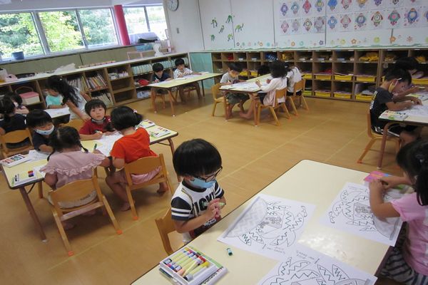 今日はみんなでギザギザの線を描きました! 上手に掛けたね☆ ご飯を食べた後はホールで親子競技の練習をしました! 今日はお家の方の代わりに先生たちが一緒にしてくれました☆