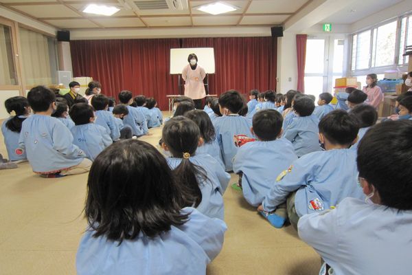 見ました!!副園長先生が「一人でおもちゃを独り占めするより、みんなで使った方がみんなが笑顔になれるよね」とお話してくださいました。