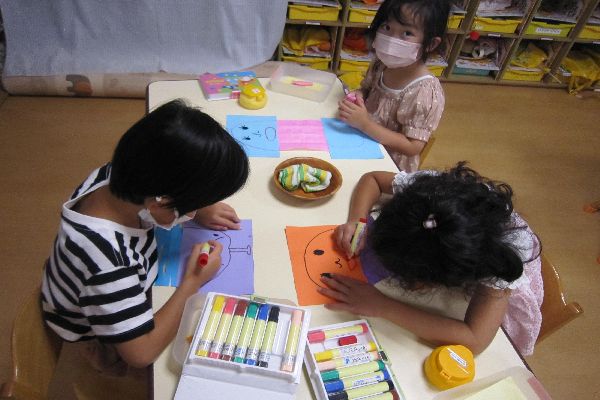 はさみで上からと下から交互に切り込みを入れ、開くとあみができました!そこに、画用紙を貼り好きなものを描いて楽しみました☆彡