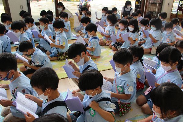 今日は品秀寺に上がり、お参りをする予定でしたが、雨が少し強かったので急遽幼稚園のホールで仏参を行いました。 初めておつとめをしました。 最後までかっこいい姿勢で頑張ったね☆