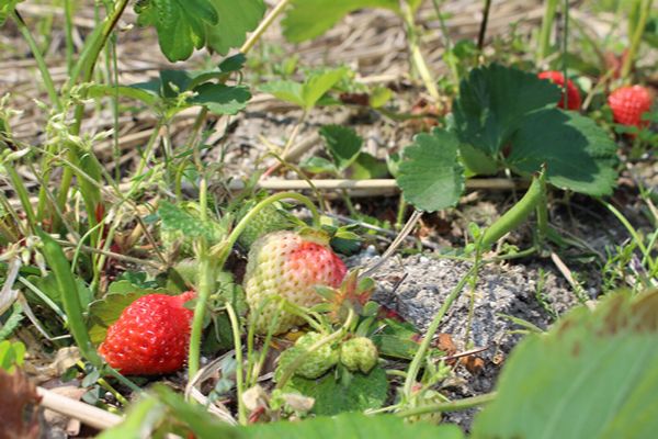 まだ、いろがついていないいちごも、おひさまのひかりをあびて、あかくいろづくことでしょう。たくさんとれたら、いちごじゃむができるかな?