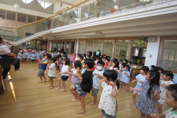 朝とお昼にホールでダンスをしています☆ 「じゃんけんパラダイス」と「ねぇ、うし、うま?」の曲に合わせて 踊っています!!みんな元気いっぱい体を動かしています☆
