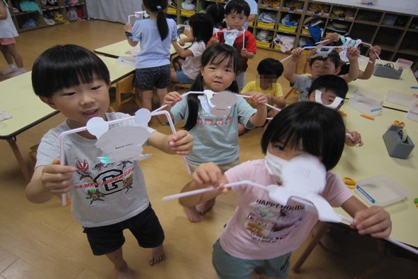 園用の七夕飾りを作り、大きな笹の葉に飾りました!