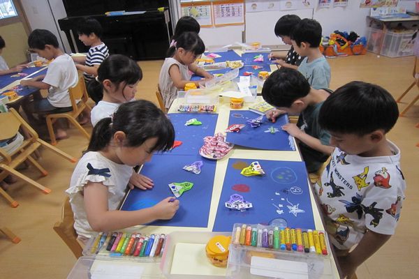 折り紙でロケットを折り、宇宙を描いて飛ばしました!