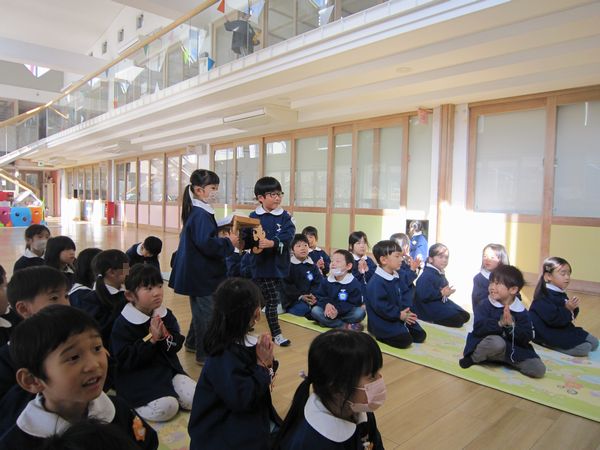 お釈迦様がお悟りを開いた日が成道会と言い、ペープサートを見ました。