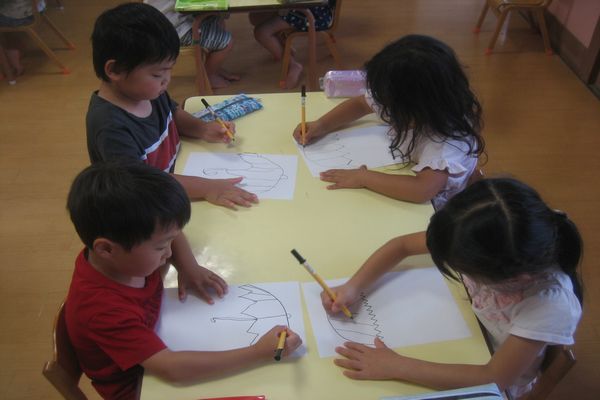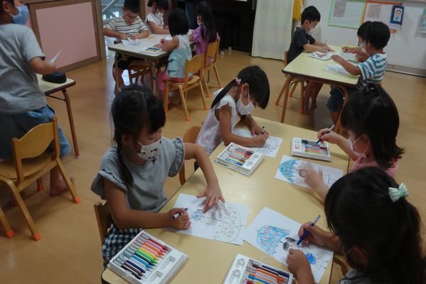 模様を沢山書いて、クーピーで色を塗ると、とっても素敵な傘になりました☆