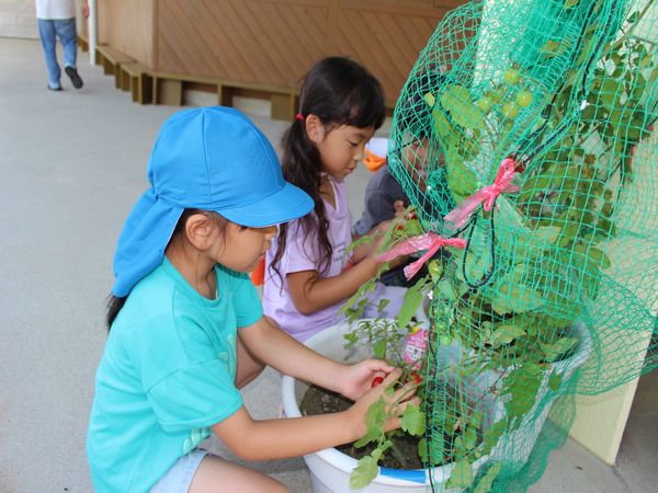 「トマトが赤くなっとる~!」と子どもたちが気づき、ミニトマトを収穫していただきました☆