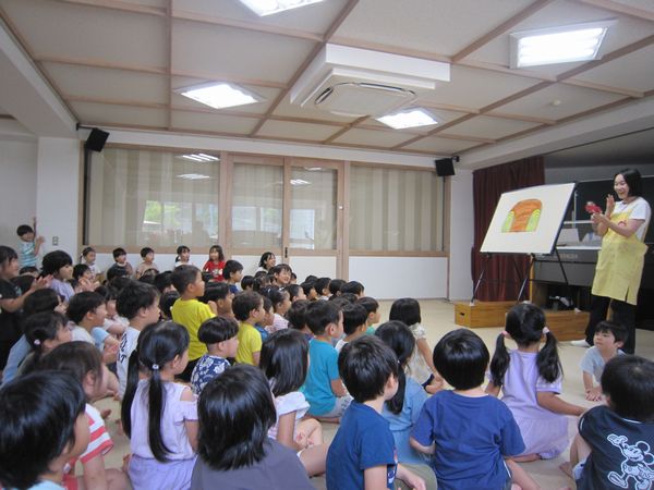 6月7月生まれのお友達の誕生会で、みんなで多目的ホールに集まりお祝いしました♫先生たちからも丸の形のシルエットクイズやへんしんトンネルの楽しいお話のプレゼントがありました!