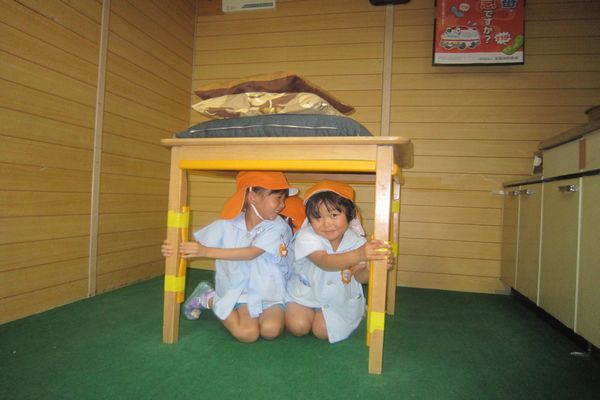 地震を疑似体験し、実際に地震が起きたらどのように身を守るかを学びました!