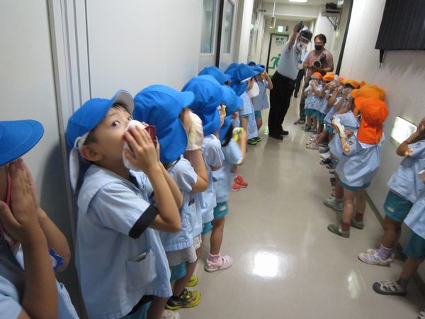 避難体験(煙体験)では、実際に視界が悪い中を壁に手を当てながら低い姿勢で歩いて避難しました!