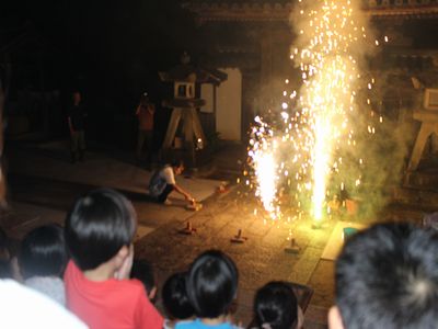 お寺に上がり、花火を見ました!