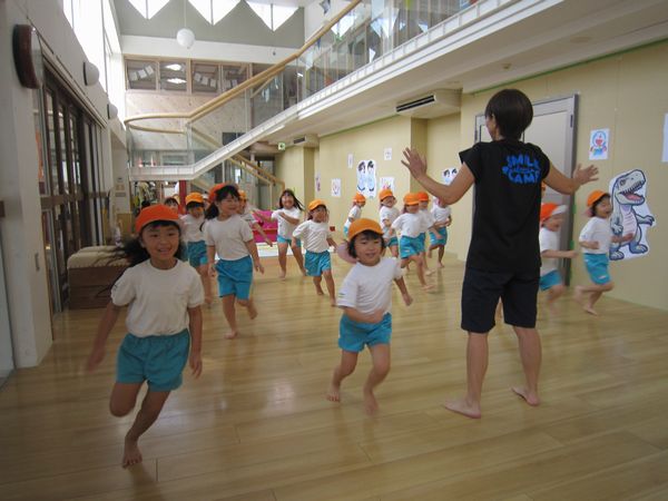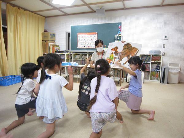 英語遊びでは動物の大型絵本を見ながら、動物と同じ動きを『can you~?』『yes,i can』の英語を使いながらやってみました♫