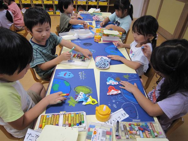 画用紙に好きなように宇宙をかいてロケットを飛ばしたら(貼り付けたら)完成です☆彡