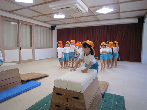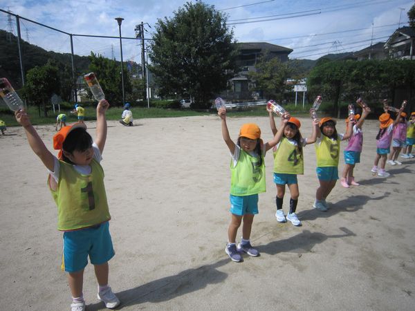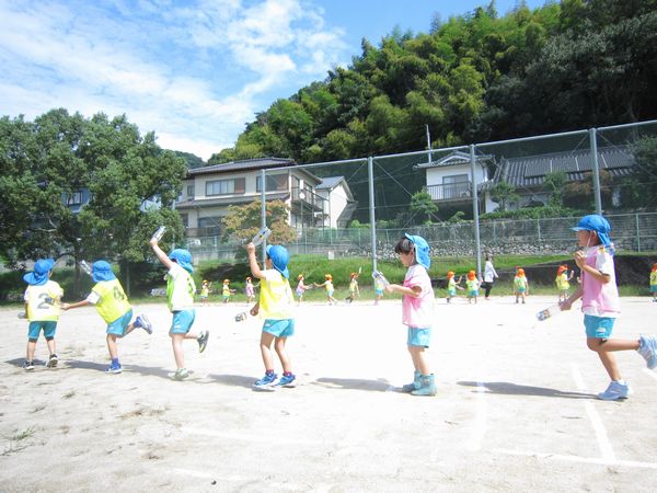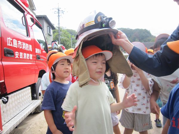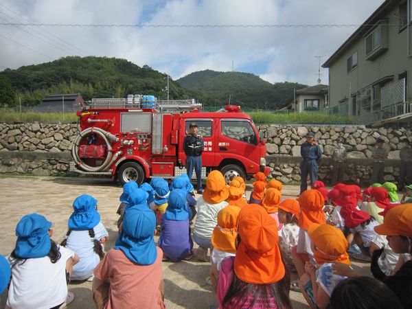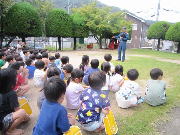 下の園庭に避難し、消防士さんから「お・は・し・も」の話を聞きました!