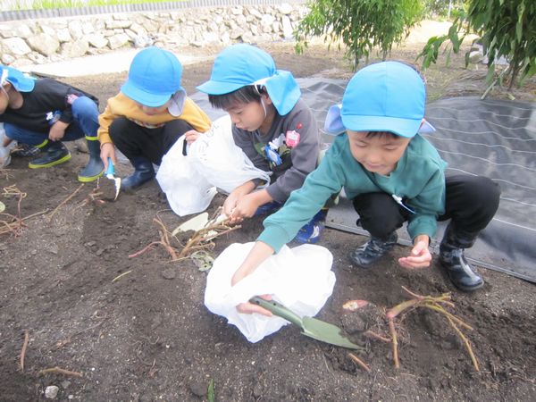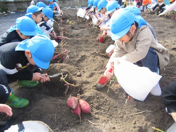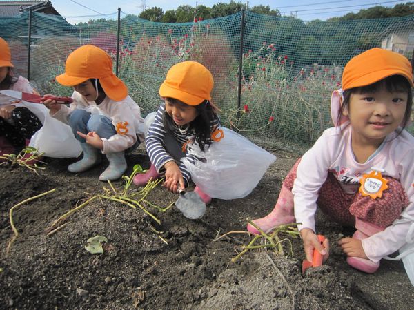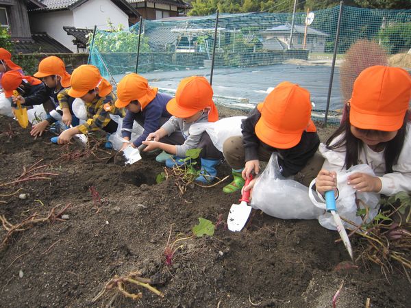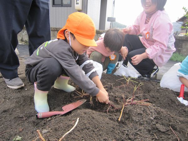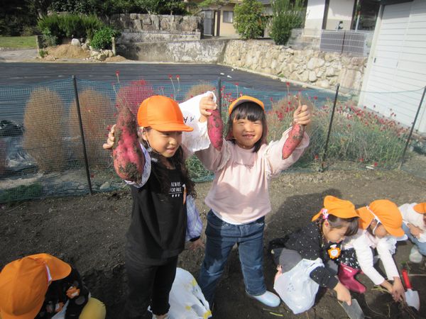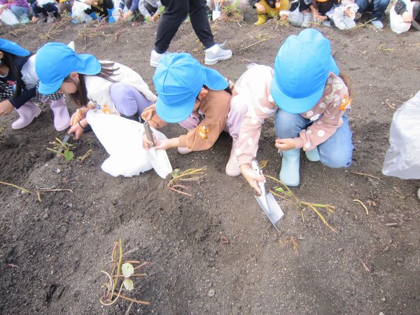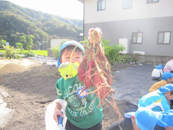 今年度は芋の葉っぱを鹿が食べたり、雨不足で園の畑での収穫が難しくなりました。しかし、バスの運転手さんのご厚意で芋ほり体験をすることができました♫