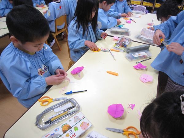 まためじろが好きな梅の花を折り紙で作り、それを見ている自分の姿を描きました!
