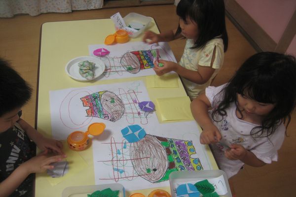 まずは折り紙を折ったり、切ったりしながら朝顔を作りました!