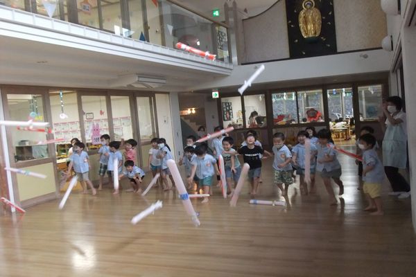 ホールや多目的ホールの広い場所に移動して、みんなでロケットをとばして遊びました♪