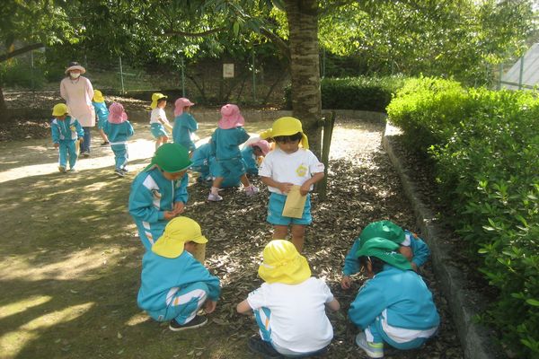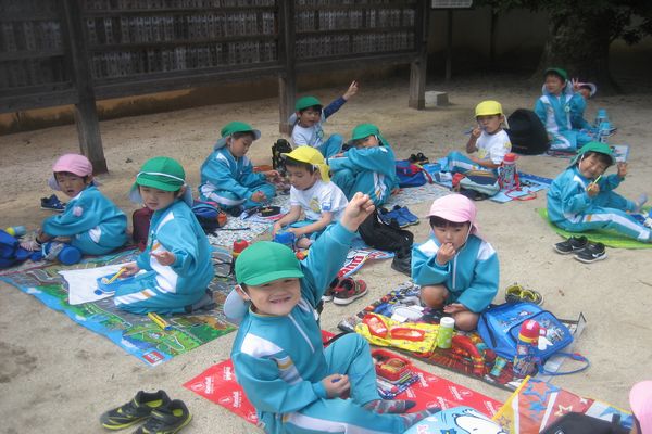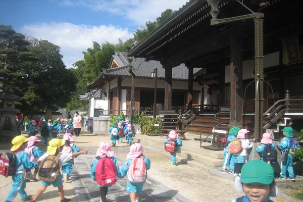 たてわりクラスのお友だちと手を繋いで、いつもとは違う道を通ってお散歩しながらお寺まで歩いて行きました!