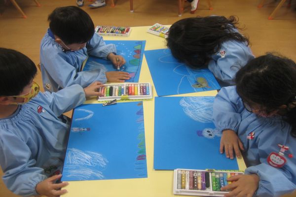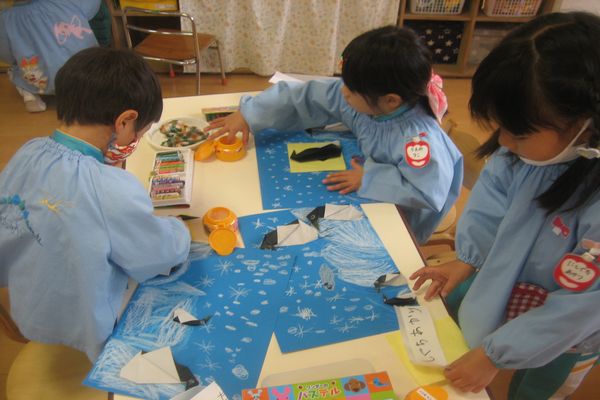 世界には南極など、もっともっと寒い場所があることを知り、どんな雪の世界に行ってみたいかみんなで話をしながら、氷の山・雪の滑り台・雪だるま・オーロラなど、みんなで楽しくお絵かきしました!