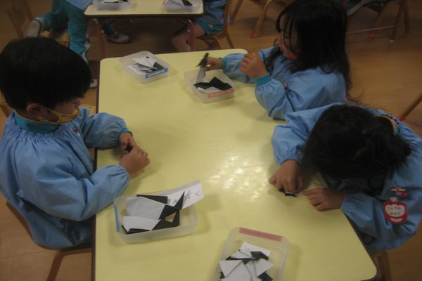 次の日には、ペンギンさんを遊びに来させてあげようと、折り紙で作りました!大人のぺんぎん2羽と、小さな折り紙で子どものペンギンも2羽作りました!
