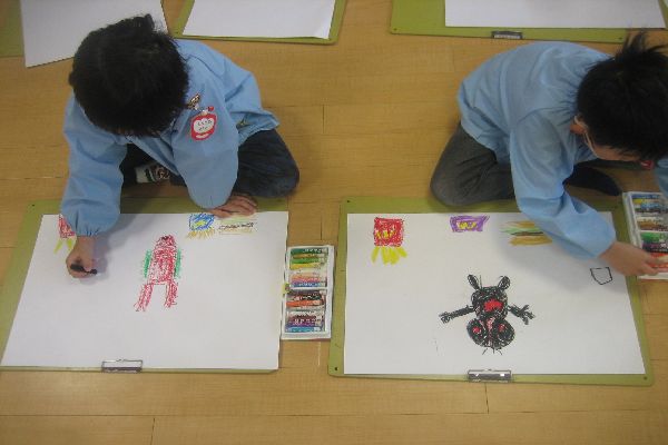 大きな画用紙に自分の〈すきなもの〉の絵をクレパスで描きました!