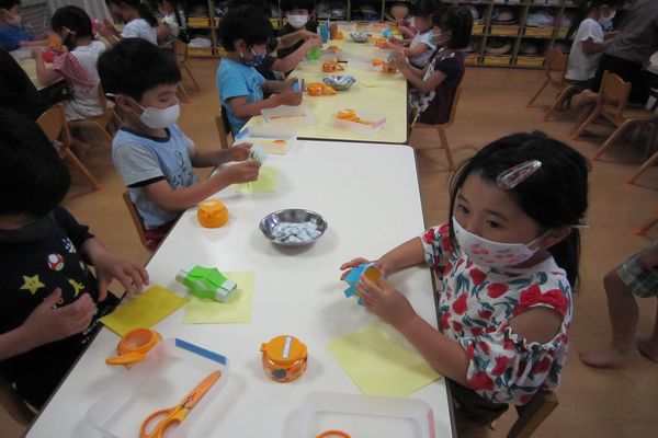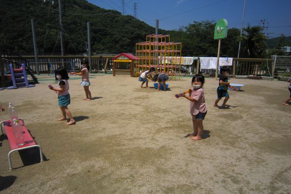 水鉄砲で的あてをしたり、空に向けて発射して雨のようにしたりして遊びました!
