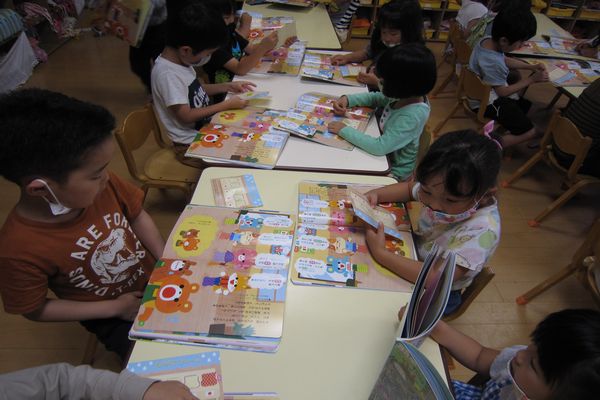 シールのところでは「右から二番目の色の長靴」と動物たちに長靴を履かせてあげました!