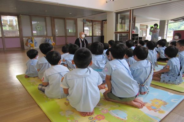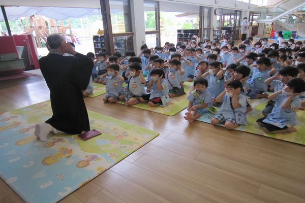 今日は、お寺に行く予定でしたが雨がたくさん降っていたので幼稚園で仏参をしました。
