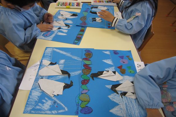 先日折ったペンギンを氷の国に貼りました!