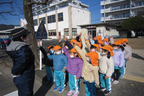 「止まる。手をあげる。右見て左見て右を見る。右を見ながら渡る。左を見ながら渡る。」と歌に合わせて、教えて頂きました。