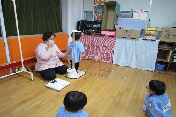 今日は幼稚園ではじめての身体測定もしました!」 みんなでおっきくなったかな~?重たくなったかな~?と身長計体重計にのって測りました。