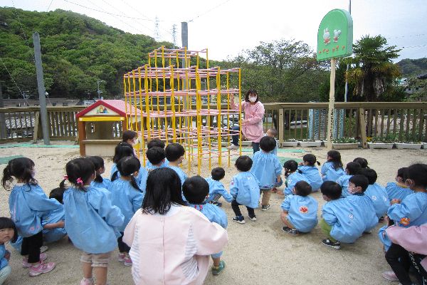 今日は幼稚園の園庭にある遊具をみんなで見に行ってみました!遊ぶ前に、上手な遊び方を聞きました☆