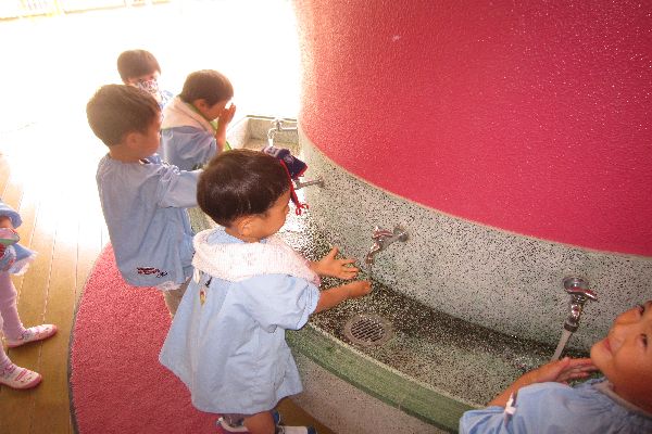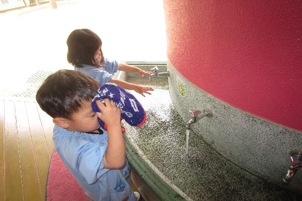 きょうから、汗拭きタオルを持ってきました。みんなで、洗顔の練習をしてみました。上手にあらえるかなあ?