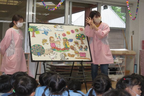4月8日は、おしゃかさまがお生まれになった日です。幼稚園では、5月17日に花まつりがあります。みんなで、甘茶をかけてお祝いする予定です。今日は、みんなで、花まつりのパネルシアターを見ました。みんな静かに見ていました。